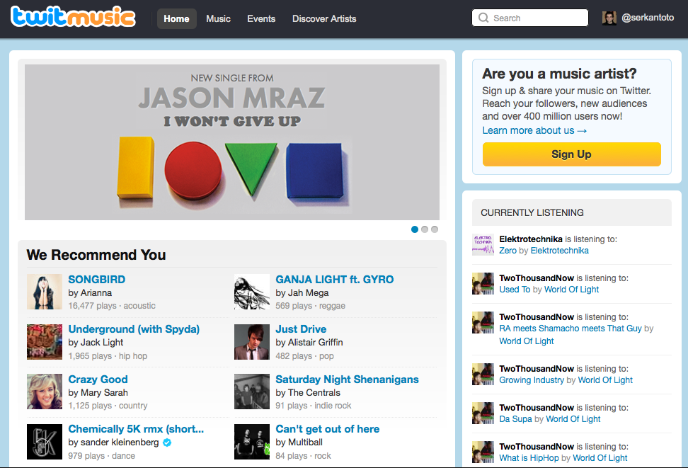 The obvious idea here is to provide artists with a more efficient viral promotion and distribution channel to reach, engage with and sell music to fans – seamlessly integrated with Twitter. Users can listen to songs for free on Twitmusic, discover new tracks or artists, and share content with followers without having to register for a new site.