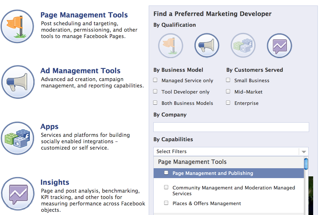 Facebook introduced the PDC in 2009 to organize these developers. It stated with just a handful of approved companies, but over time its marketing products got more varied and complex, and the ecosystem of developers offering tools and services proliferated. There’s now huge players in Page management and app creation like Buddy Media, Wildfire, Vitrue, and Involver, Ads API tool and service providers like TBG Digital, AdParlor, and Nanigans, and Insights experts like PageLever and EdgeRank Checker. Many of these companies offer services in several areas of expertise, so the simple, separate lists of PDCs and approved Ads API partners became inadequate.