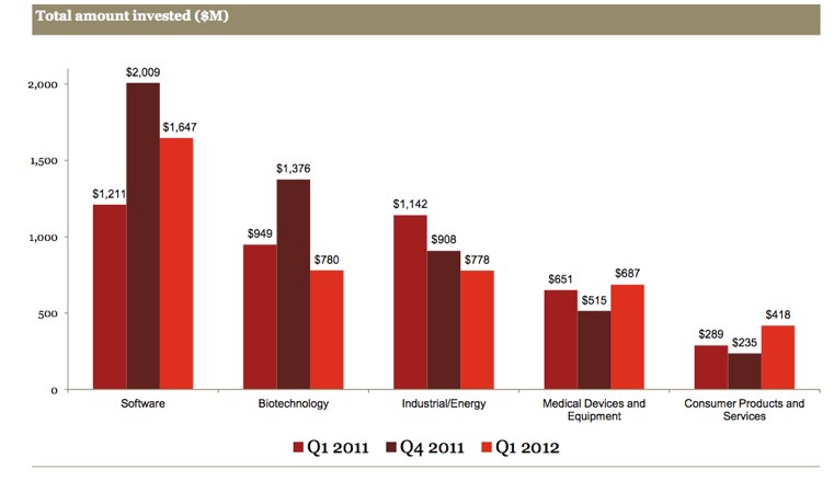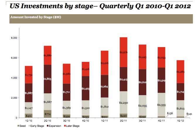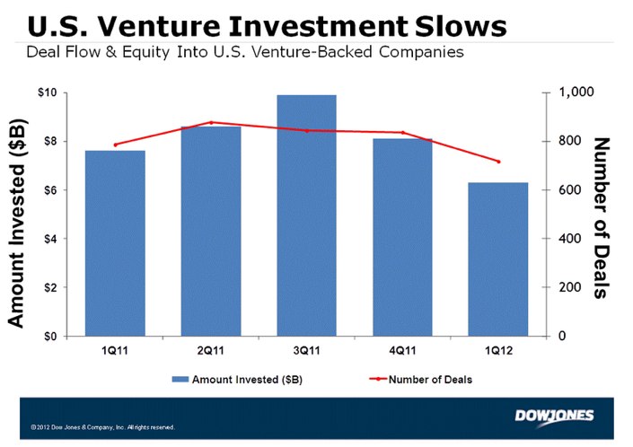 Dow Jones VentureSource reports in a separate study that U.S.-based companies raised $6.3 billion through 717 venture capital deals during the first quarter of 2012, an 18% decline in capital and 9% decline in deals from the same period last year. And the median amount invested in a financing round fell 13% to $4 million in the first quarter of 2012.