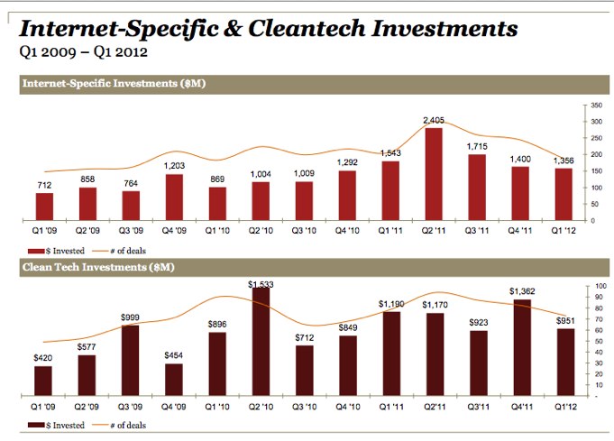 Internet-specific companies received more than one billion dollars for the eighth consecutive quarter with $1.4 billion going into 188 deals, which is 3 percent lower in dollars and 23 percent lower in deals than the fourth quarter of 2011 when $1.4 billion went into 244 deals.