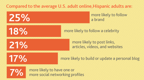 Plus, Hispanics are 25% more likely to follow a brand, 18% more likely to follow a celebrity, 21% more likely to post links, articles, videos and website, and 7% more likely to have one or more social networking profiles.