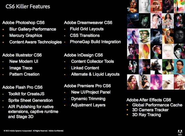 Today is a big day for Adobe. Not only is the company officially unveiling the next versions of virtually all of the applications in its Creative Suite, but Adobe is also launching its Creative Cloud online offerings. This marks a major change in how Adobe is selling and marketing its flagship product: while the company will continue to offer a shrink-wrapped version of CS6, it’s also introducing a subscription service with this update. For $49/month with an annual subscription or $79/month for month-to-month memberships, users can now get full access to any CS6 tool, including Photoshop, InDesign, Illustrator, Premiere Pro and AfterEffects. The suite will also include Adobe’s new HTML5 design and development tools Muse and Edge, and will be deeply integrated into the company’s tablet apps. Users will be able to download and install these apps on up to two machines.