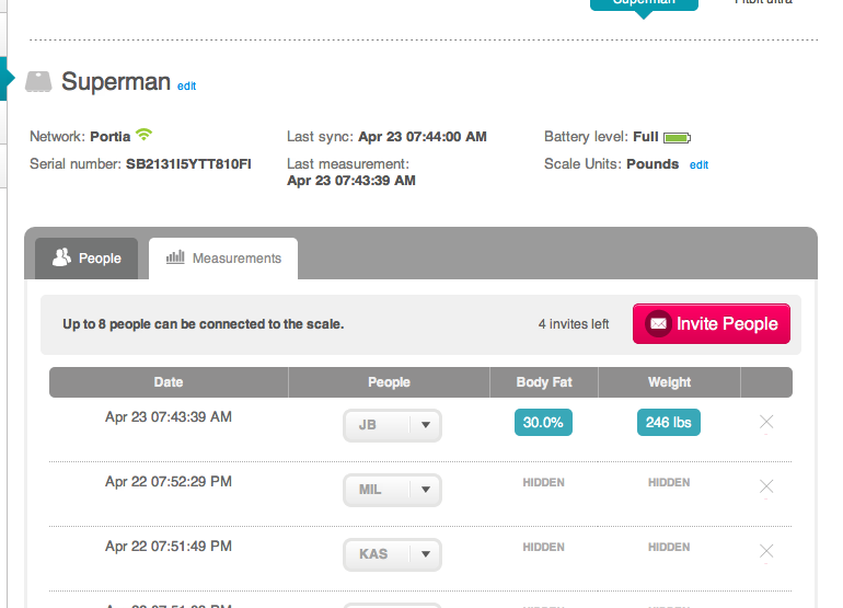 The Aria supports up to 8 users and it senses uses based on previous weight measurements. When the wife or kids hop on, you see their readings (if shared) pop up in the main user’s account. To take body fat percentage measurements you need to take your weight reading with your socks off. Once the Aria senses your vitals it transmits them via WiFi to the server.