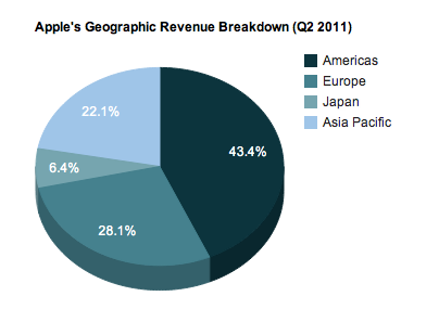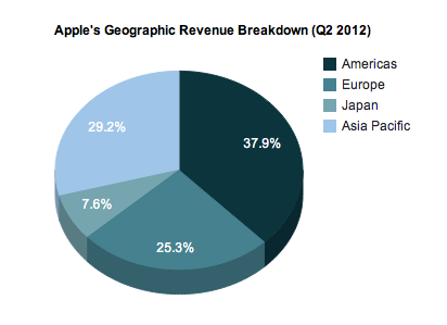 Here are some charts illustrating Apple’s revenue breakdown by geography from this quarter compared to the same time a year ago. I excluded retail revenues: