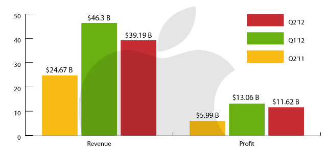 Apple has just posted their Q2 2012 financials, and revealed that over the last 14 weeks the company has pulled in $11.6 billion in profit on $39.2 billion in revenue, which breaks down to $12.30 per share. Analysts expected earnings of $10.02 per share on $36.81 billion in revenue.