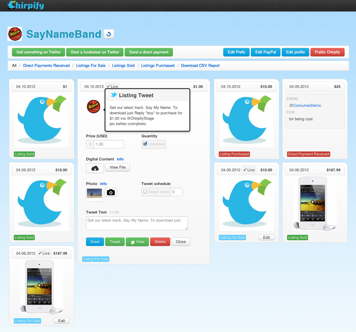 But what if your brand or band is already using a storefront to manage transactions? Chirpify also offers integration with existing eCommerce storefronts (like Magento, for example) so that brands can leverage back-end fulfillment, listing, and transaction management. Merchants just click the “list on Twitter” button when creating a listing for sale, either in their eCommerce or Chirpify dashboard, and can then set the price, quantity, shipping price, and shipping timing.