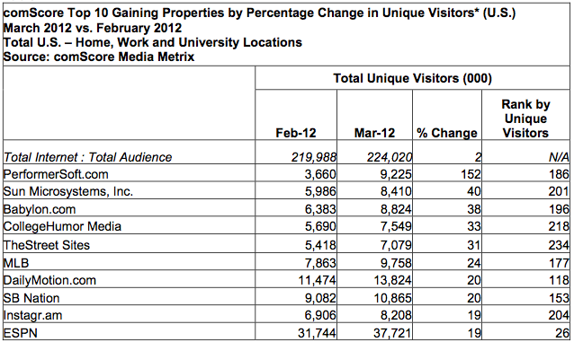 As for the top properties seeing the biggest change in unique visitor counts from February to March, interestingly PerformerSoft.com — the makers of software like PC optimizer, driver automatic updater, data recovery, etc — saw a 152 percent hike in traffic, up to 9.2 million visitors. Rounding out the list, in order, were Sun Microsystems, Babylon.com, College Humor, TheStreet, MLB.com, DailyMotion, SB Nation, Instagram, and ESPN.