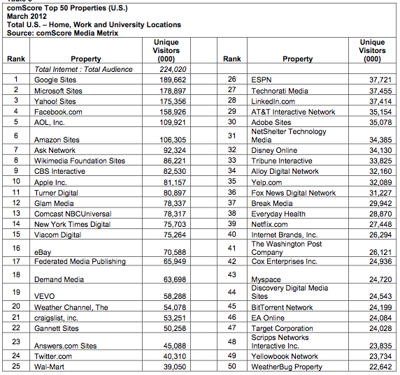 As to the top 50 web properties, comScore found a usual suspect at the top of its rankings, with Google Sites bringing in 189.7 million visitors in March. Microsoft Sites came in second at 178.9 million, followed by Yahoo! Sites at 175.4 million, and Facebook.com at 158.9 million. In terms of March movers, Ask Network rose into the seventh spot, while ESPN vaulted six positions to 26th place.