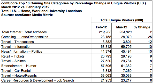 ComScore today released its analysis of this month’s top properties on ye olde Webernets in the U.S. There are a number of points of interest, but among them, it seems that lotto sites were the top beneficiary of U.S. Internet traffic. This was largely a result of the unprecedented Mega Millions jackpot, which became the largest jackpot in U.S. and world history, reaching $656 million in March. Lotto sites drew nearly 29 million visitors (with MegaMillions.com grabbing the top spot), up 25 percent from February, making it the biggest mover in March.