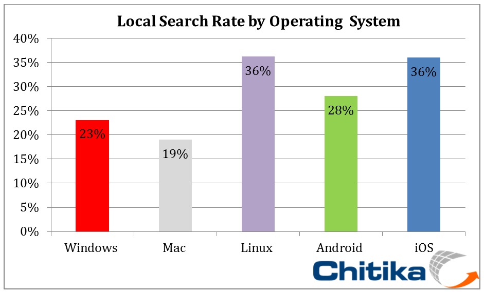 Chitika, which says that it analyses hundreds of millions of ad impressions on its network to mine this data, also provides some figures on how local search — for local services or news, for example — is faring as a percentage of all searches. Here, too, Apple’s mobile iOS scored the highest, with 36 percent of all searches on the platform dedicated to local results. It ties with Linux, also at 36 percent, with Android at 28 percent.