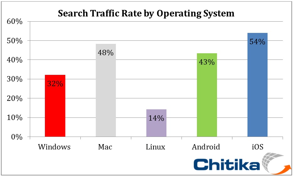 Linux sees the smallest number of searches of all at 14 percent. And while Chitika doesn’t answer why Google and Microsoft’s platforms are not seeing as many search queries as Apple’s, it does have a possible explanation for why Linux rates the lowest: “Linux devices tend to be used for operational and development purposes.” I guess developers don’t need to search as much as average consumers.