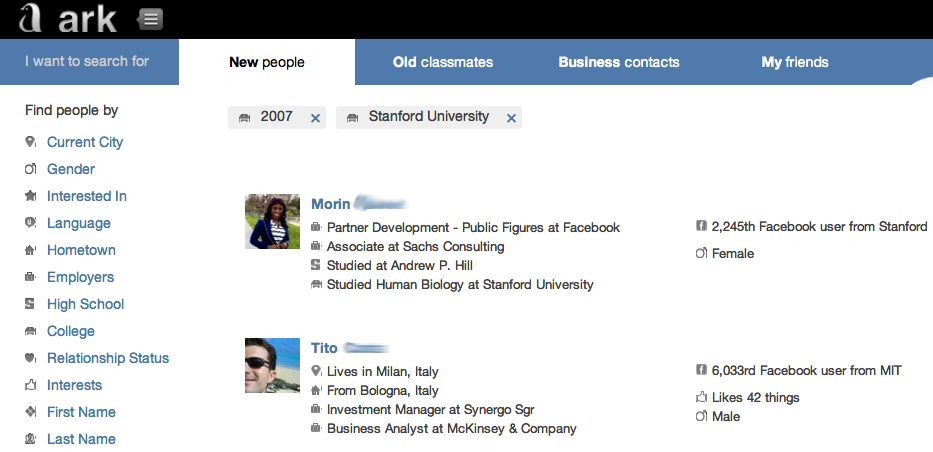 I was the first to write about Ark’s beta last month, where I detailed how the product lets you layer filters to find out which of your friends are single, who are in your current city and is fluent in a language you want to learn, or who lives somewhere you’re visiting and Likes a band performing there so you could go to the concert together. This is all data scattered across Google+, Twitter, and particularly Facebook. Ark’s search pulls in info from all these sources plus profiles on LinkedIn, Foursquare, Myspace, Orkut, Meetup, Vkontakte, and Ren Ren.