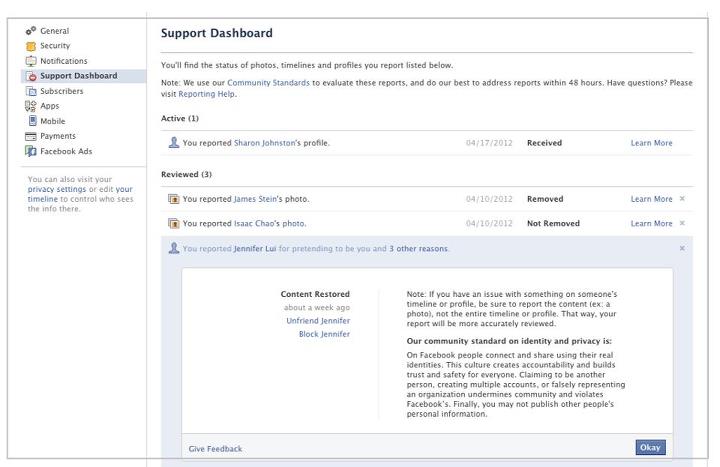 Facebook wants you to know it’s listening when you report bullying, hate speech, identity theft, and spam, so today it launched a new Support Dashboard for tracking these reports until they’re resolved. Users can check to see if their report has been reviewed, be notified of whether the offensive content was removed or left up, and learn why the decision was made. The Support Dashboard is gradually rolling out to the Account Settings menu starting today with Facebook tracking Timeline and photo flags there, and monitoring for more content types will be added soon.