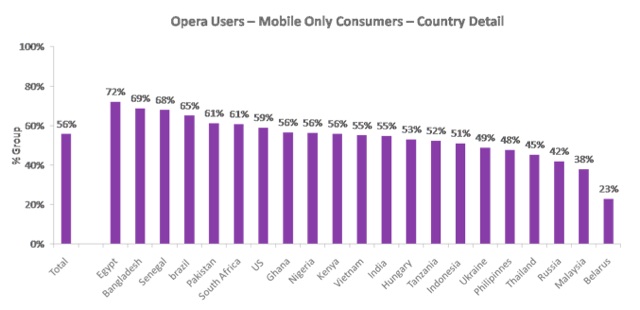 The study, which was conducted between November 2010 and November 2011, found that globally, 56% of Opera users and 43% of those who use another browser only access the Internet via their mobile devices. In some countries, including Egypt (72%), Bangladesh (69%), Brazil (65%) and South Africa (61%), these numbers for Opera users are significantly higher. At first glance, these numbers look very high. Given that traditional wired Internet access in many of these countries is rather limited, though, mobile phones are often the easiest and cheapest way to get online for many of these users.