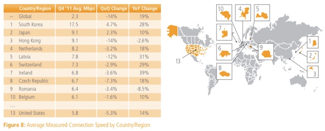 It’s worth noting, though, that the long-term trends look significantly better. Compared to a year ago, the average global connection speed increased by 19%. Year-over-year, most countries made significant strides. In the U.S. the average connection speed was up 14% compared to Q4 2010 and the average speed in South Korea, which was already leading the pack, increasing by another 28% to 17.5 Mbps.
