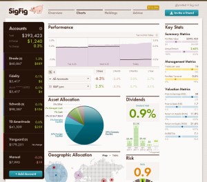 Enter SigFig. Launching in public beta mode today, SigFig is a web application that tracks all of your various investments — bank accounts, 401k plans, IRAs, stock holdings, and the like — and gives tailored recommendations about your portfolio’s performance and changes that you could make. The software is really powerful, and the user interface design is super slick.