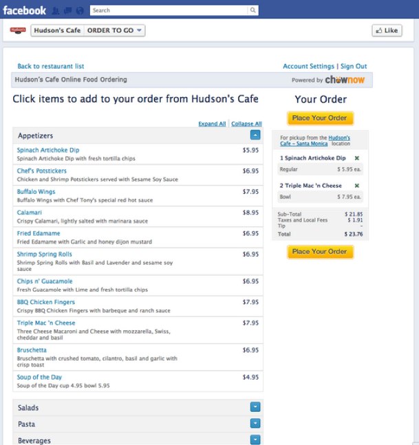 ChowNow is actually betting on Facebook as a destination for consumers to order food. Via the startup’s Facebook Ordering App, restaurants can take orders directly through their Facebook page. The startup says that because more than 70 percent of U.S. restaurants have a Facebook presence, and potential customers are flocking to the social network for engagement; Facebook makes sense as a possible destination.