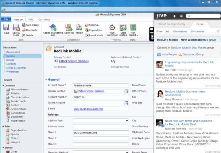 Via a new plugin, users can now integrate Jive Anywhere, which allows users to search their Jive networks and access information from their browser. So within a web-based CRM product, you could look up deal discussion and documents in your Jive network without having to leave the page.