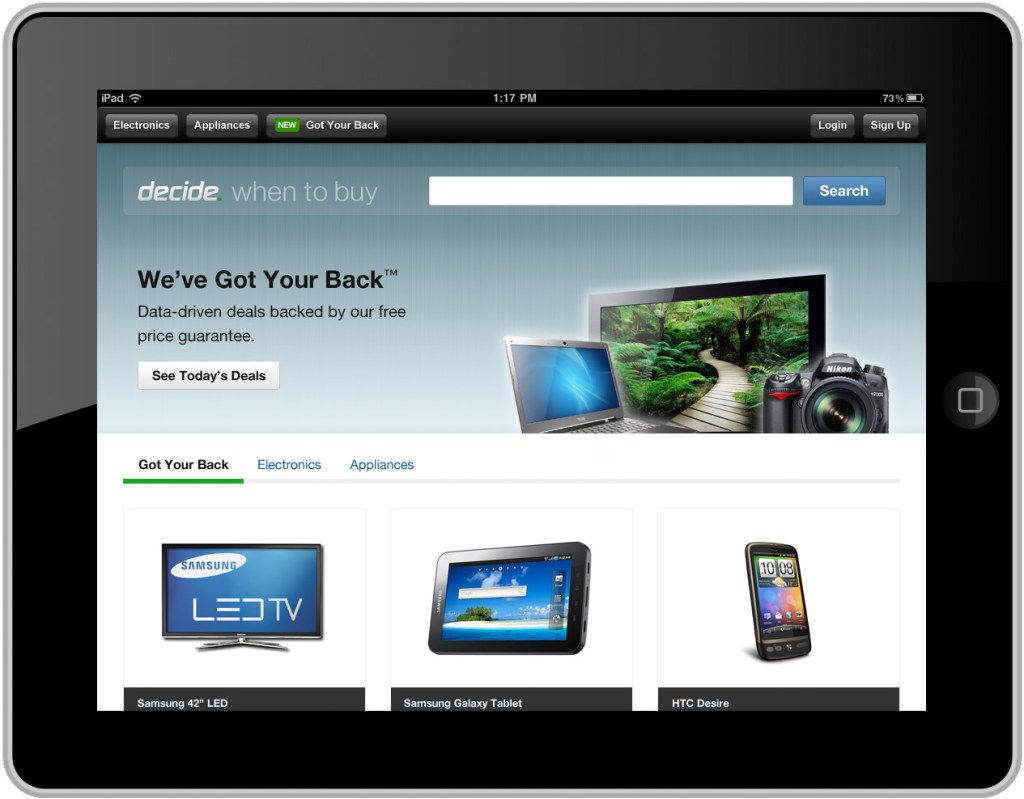 Smart shopping service Decide.com, which started off with a focus on consumer electronics before its recent addition of home appliances, is a unique player in the comparison shopping market. The service doesn’t just return prices and reviews, it actually tells whether to buy or wait to buy a given product by analyzing market conditions, trends, news, product release history, and more. Today, that same shopping experience has arrived in a handy new format: an iPad app.