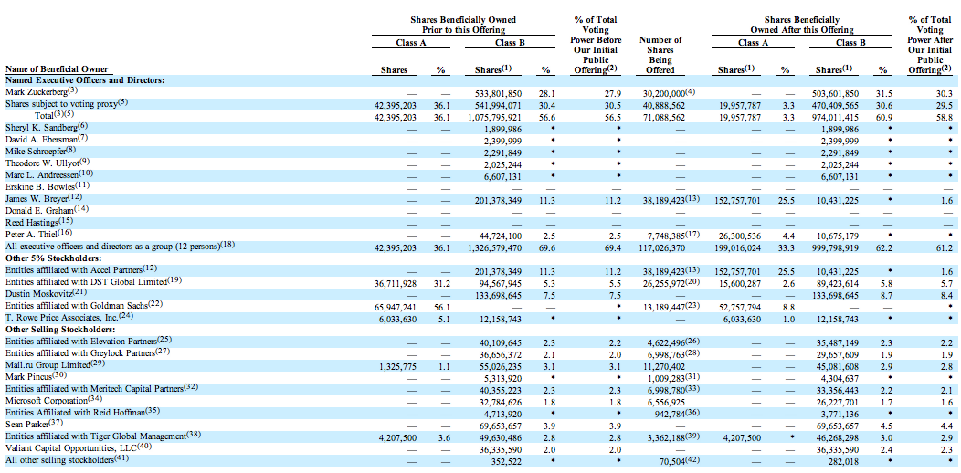 Zuck’s not the only one selling shares either. So are Accel’s Jim Breyer*, Peter Thiel, LinkedIn founder Reid Hoffman and Zynga CEO Mark Pincus. Then there are the institutional entities like Accel* and DST. In fact, it’s Breyer and his firm Accel that are walking away with the biggest immediate payday from the IPO.