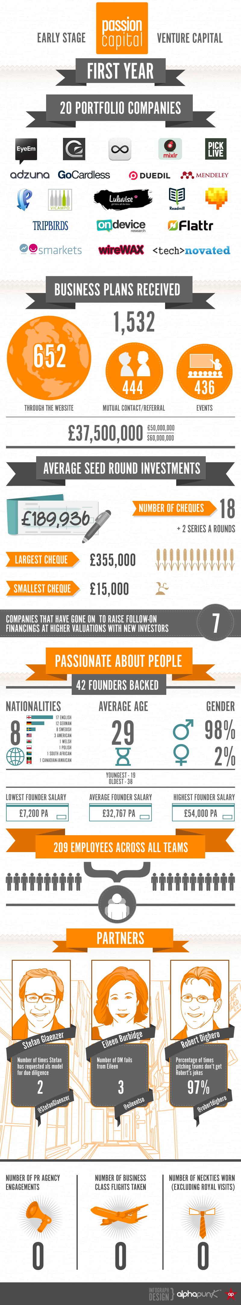 As part of their one year anniversary Passion has produced a couple of interesting info graphics (see below) from data they’ve collected. I dare say we could get some nice stats from other players, but it’s possibly the first time I’ve seen this done in Europe and especially from a VC.