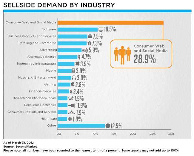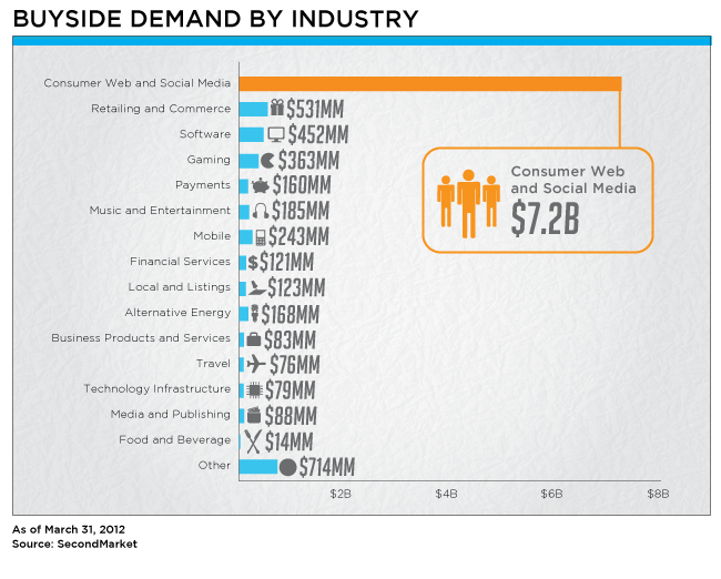 In terms of buyer interest, most buyers wanted “consumer web and social media” companies. Keep in mind that this data might look very different from the rest of the year, as Facebook stopped trading on SecondMarket in April. Investors put in “Indications of Interest,” or said they were willing to buy $7.2 billion in shares of “consumer web and social media” companies. Retailing and commerce, software and gaming followed.