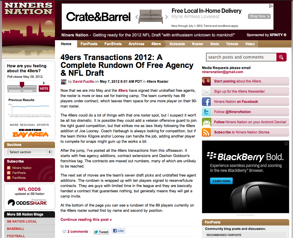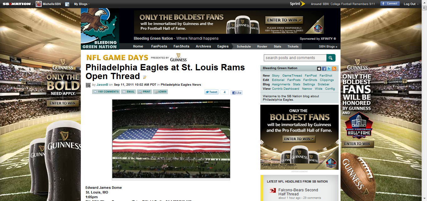 The main way that Vox is making money is ads. But, the company is able to offer something many others aren’t, which is increasingly large volumes of users who organize themselves by very specific interests. When the dozens of SB Nation football blogs cover game days in detail for each team, it’s a no-brainer for a beer company — Guinness, in the example above — to wrap itself around that branding. Literally, as you can see. There’s a background takeover, a top banner, a main ad to the right, and then the “presented by” branding around NFL Game Day. And, a contest for fans to engage with as they’re reading and commenting.