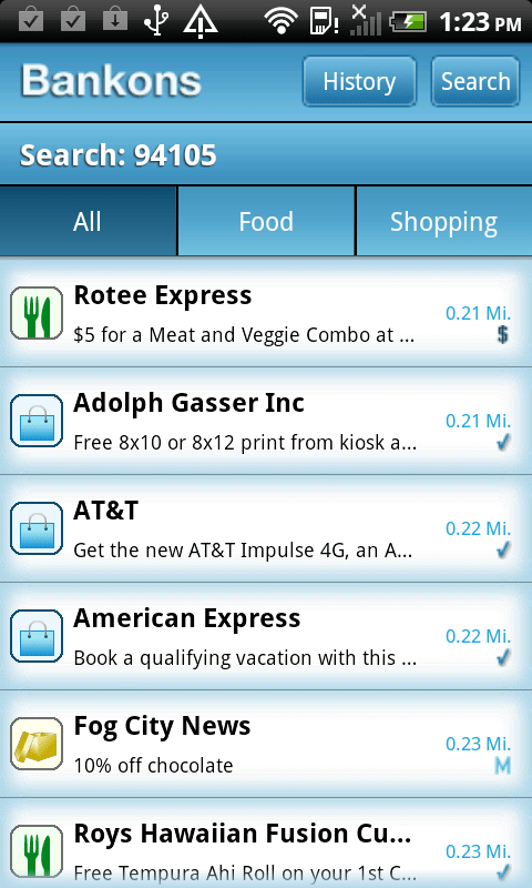 Here’s how it worked: After you created an account and entered your bank card login data, Bankons, which was built on top of Yodlee, accessed your transaction history to determine your spending habits and find the nearby deals best suited for you. Bankons utilized your transaction history as well as other local deals like Foursquare, which it could also use to verify your location. And the app allowed you to search for any zip code even if you were not currently in it, and then save the offers you liked.