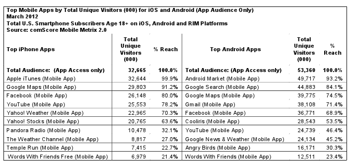 On the iPhone, iTunes was the top app, with 99.9% reach (what, did someone figure out how to delete iTunes off of their iPhone?), and was followed by Google Maps, at 91.2% reach. Facebook, meanwhile, was in the #3 spot, with an 80% reach. On Android, the rankings were a bit different – the Android Market…excuse me, Google Play store…was #1 (93.2% reach), followed by the Google Search app (84.1%), Maps (74.5%), Gmail (71.4%), and then Facebook (68.9%). Clearly, the numbers show that Android users gravitate towards Google’s own branded apps.