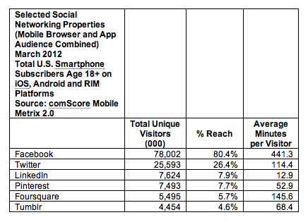 ComScore also looked at social networking properties by audience size, a measurement determined by both app usage and mobile site visitors. In this case, Facebook was an easy winner, with the average Facebook mobile user engaging for over 7 hours via browser or app in March. Twitter saw 25.6 million mobile users, engaging for nearly 2 hours during the month, but this statistic didn’t include usage by third-party apps (of which there are many), so may not be as accurate. People visiting Twitter on their computers spent only 20.4 minutes on Twitter.com, which comScore says highlights the importance of mobile engagement for brands. However, again, Twitter.com metrics are not the only way to account for Twitter users who engage on a Mac or PC – there are dozens of client applications, available both as desktop applications and those which run in the browser, neither of which were counted here.