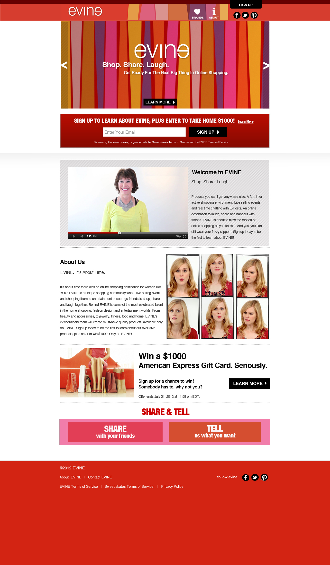 The site, which is designed by Leane Brenes, launches to the public today, along with a complementary “coming attractions” platform on Facebook, which invites members to join for free and learn more about what brands Evine will offer beginning this summer.