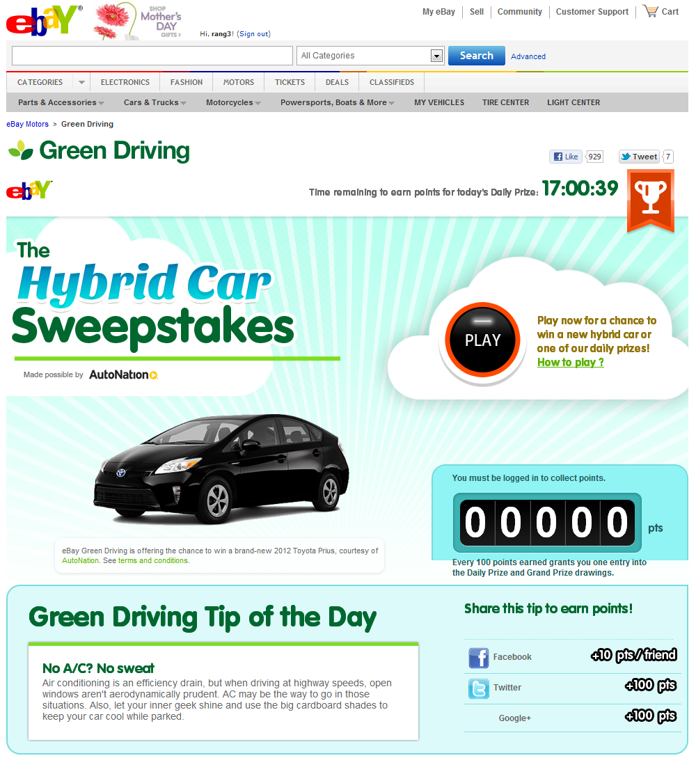 eBay is also using PunchTab to promote its Green Driving initiative by giving away a 2012 Prius, with a goal of generating Facebook messages that will send traffic to a page on green.ebay.com.