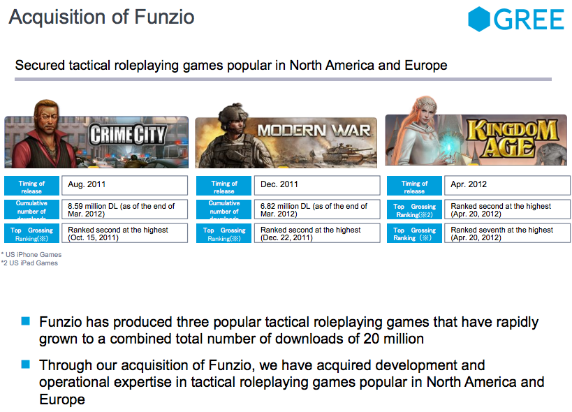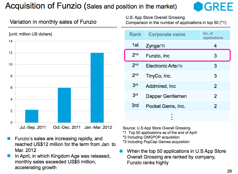 The numbers were revealed in GREE’s earnings statement today. Funzio’s acquisition comes at a very fascinating time for GREE, a $4.8 billion mobile gaming company from Japan. Like Zynga in the U.S., GREE and its archrival DeNA are part of a younger vanguard of freemium gaming companies that have found success in their home market of Japan. The company made $168.5 million (13.4 billion yen) in net income on $578.9 million in revenue (46.2 billion yen) in the quarter ending in March. Just for comparison, that’s about 80 percent more revenue than Zynga in the same time period.