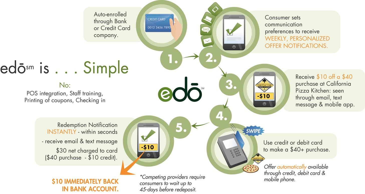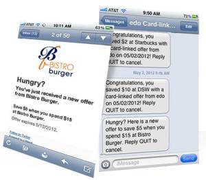 So how does the service work? For starters, the banks will target users based on their spending behavior. And really, just the spending behavior – the banks don’t need to pull any personally identifiable info, your demographic profile, or anything else but how you like to spend and where you spend in order to start sending you offers. And you don’t need a mobile app to receive them. Although a smartphone application is part of edo’s platform, non-smartphone owners can choose to receive offers via text or email.