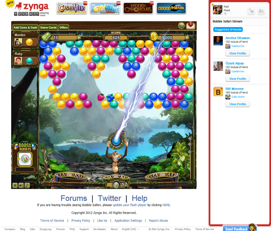 Stepping back, Bubble Safari along with Zynga’s recent launches Hidden Chronicles, a hidden object game, and Slingo, a casino-style game, show how the style of gameplay on the Facebook platform has diversified over the last year and a half.