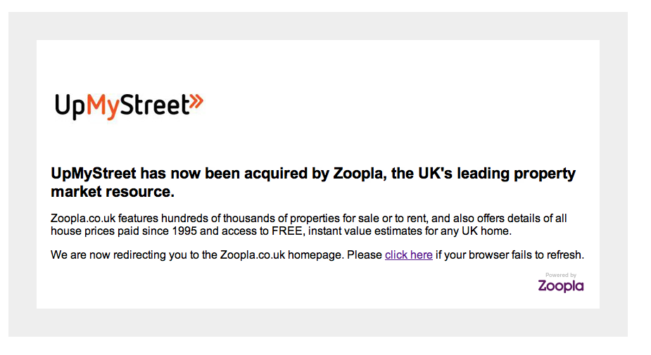 Financial terms of the deal were not disclosed, but it looks like the acquisition means curtains for the UpMyStreet brand, one of the oldest local-listings sites in the UK: if you visit that URL now you will see that the site now automatically redirects to Zoopla’s pages, with no sign of UpMyStreet branding to be seen.