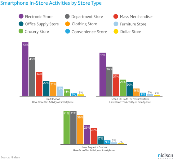 For starters, mobile coupons are most popular at grocery stores, (41% of mobile shoppers said they used coupons there), department stores (41%), and clothing stores (39%). At electronics stores, the majority (73%) read reviews, compare prices (71%), and scan QR codes (57%).