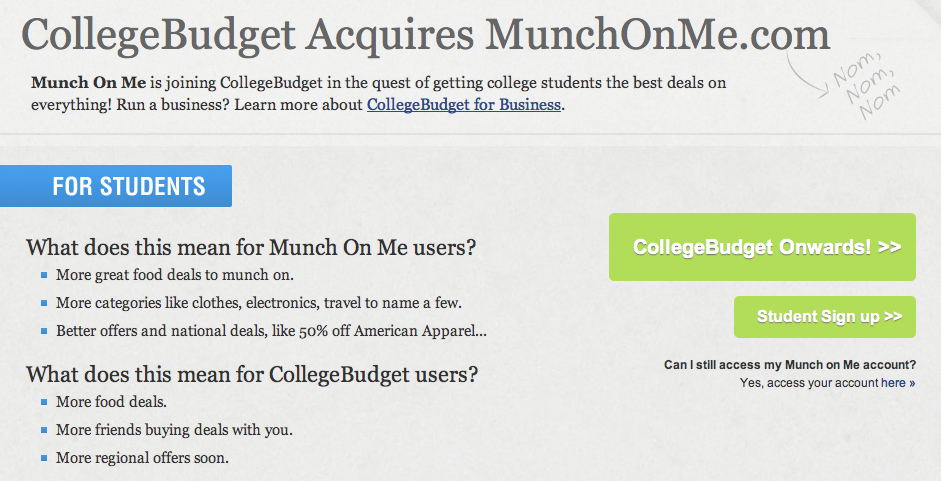 Today, CollegeBudget is moving more aggressively into local offers, particularly around food. For hungry, cash-strapped college students, food discounts can be extremely appealing, especially when one of the alternatives is the school’s cafeteria. This is where Munch On Me comes into the picture. Munch On Me is a daily deals site for food, which Alexia described as a “Groupon for food — done right.”