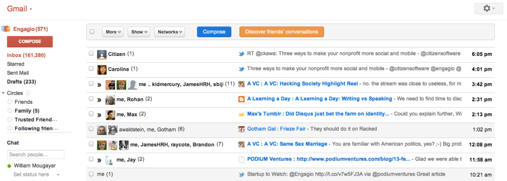 What’s the best way to manage our conversations across all the websites and social networks we’re visiting? William Mougayar, founder and CEO of Engagio, says that it’s through a Gmail-style social inbox — after all, that’s the interface we use to handle most of our communication already (not that everyone’s happy about that), and heck, it’s the way many of us read our social network updates already.