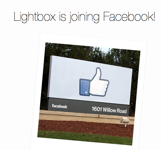 Facebook is not acquiring the company or any of the user data hosted on Lightbox.com. In the coming weeks, we will be open sourcing portions of the code we’ve written for Lightbox and posting them to our Github repository.