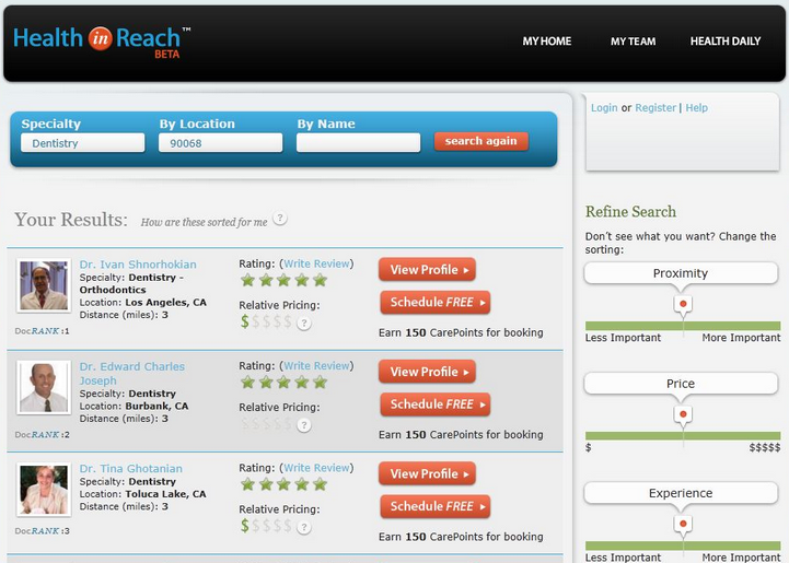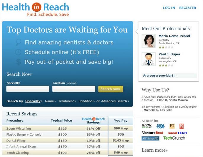 Founded in 2009 by Scott Sangster and incubated in healthtech accelerator Rock Health’s inaugural batch, HealthInReach is tapping into this need by offering a transparent online marketplace for healthcare. The startup has essentially devised a consumer-focused (or B2B2C) complement to Castlight, whereby those who are uninsured or pay out-of-pocket for medical procedures can use its marketplace to search for and learn about doctors, dentists, based on experience, reputation and prices.