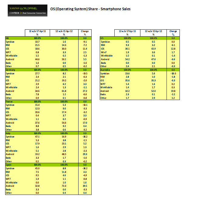 In Spain, Android also saw the biggest gains in terms of sales in the last 12 weeks: its 72.3 percent share of sales represented a huge rise of nearly 40 percent on a year ago. The platform saw similarly large growth in Germany (up 27.2 percent to represent 61.8 percent of sales); France (17 percent up to 54.6 percent); Italy (up by 29.3 percent to account for 48.5 percent of all sales) and Australia (up nearly 20 percent for 52 percent of all sales).