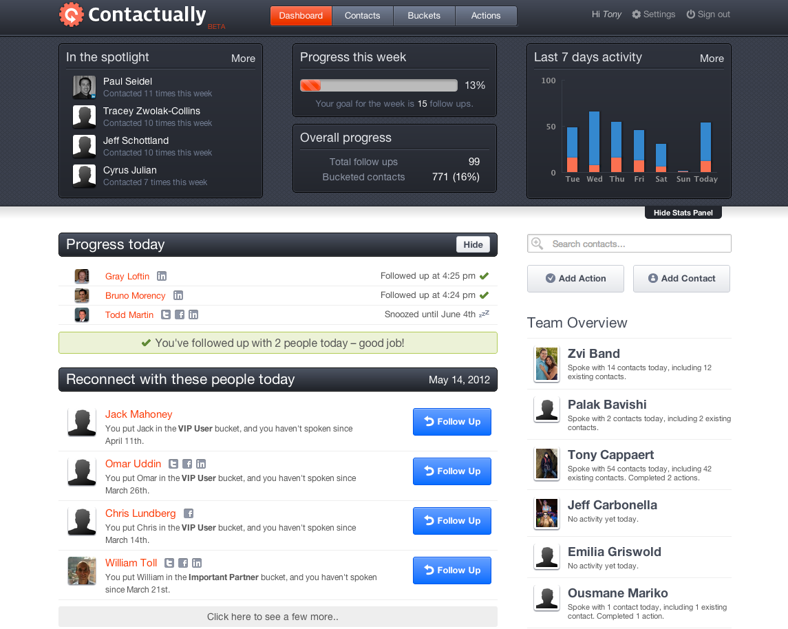 Before delving into the details of what’s new, a little refresher on how Contactually works. When you sign up for the service, it pulls in information from social networks like Facebook, Twitter, LinkedIn, Klout, Quora, Flickr, Foursquare, Tumblr, Skype, and dozens of others, and integrates those into your new online address book. The address book tracks how often you and your contacts correspond and their priority. Another key part to the service are “Actions” – which are reminders to follow up with your contacts. These appear on the online dashboard and are sent out via email.