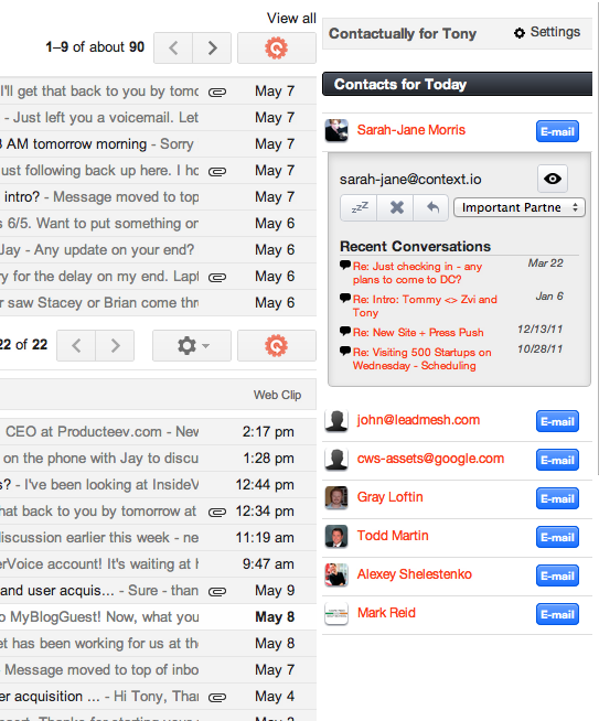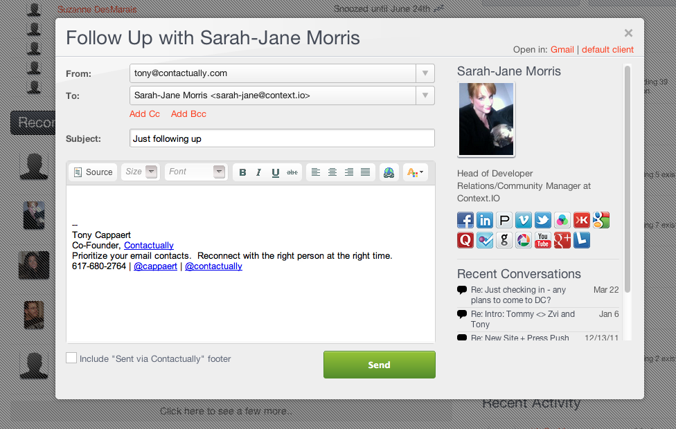 Contactually is also rolling out more integrations, including support for messaging and contact import from LinkedIn, integration with SugarCRM, and plans to add CapsuleCRM, Producteev, and MailChimp in the next month. (Highrise and Salesforce are already supported).