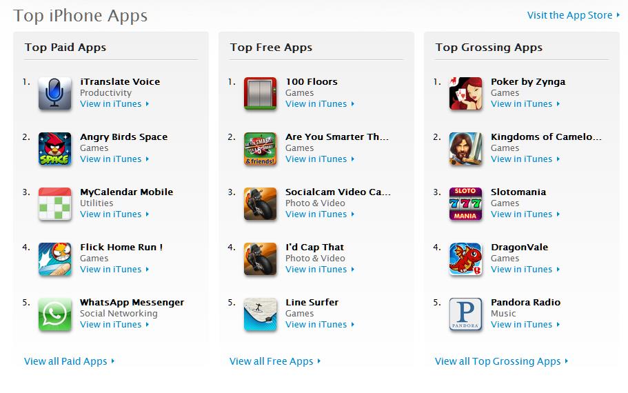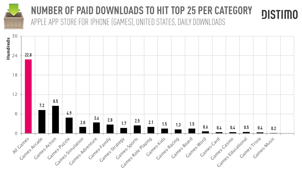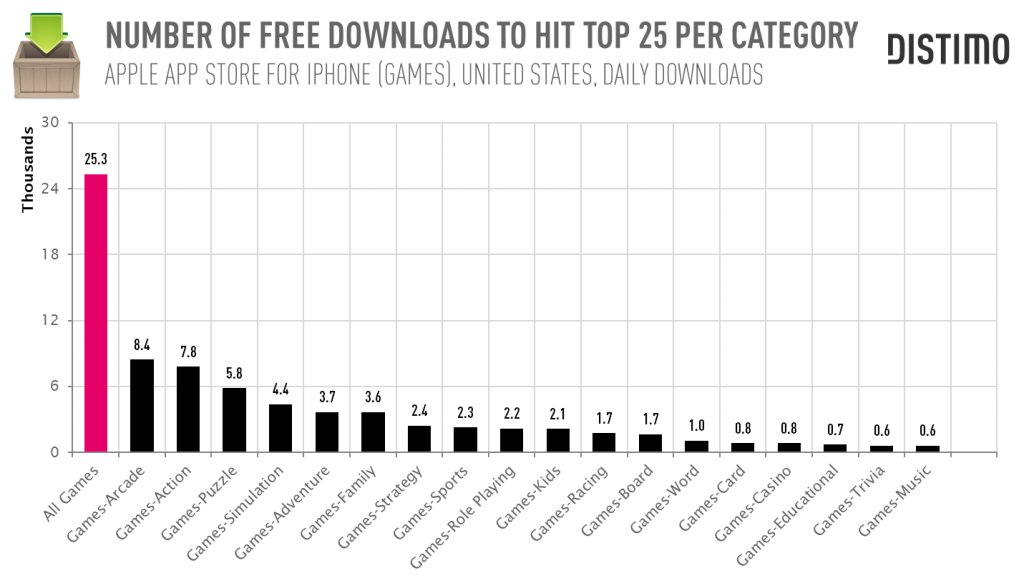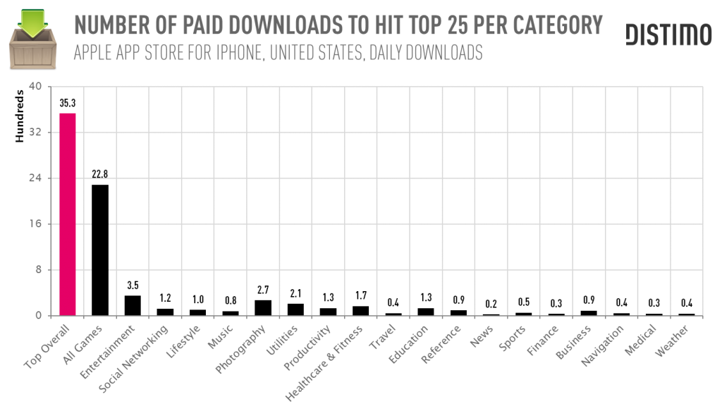 It’s hard to underestimate how important ranking in Apple’s top 25 in the iTunes store is for mobile app developers. After all, the top 25 is probably the single most important app discovery mechanism for most iOS users. But how many downloads does it take to rank in the top 25? Mobile app store analytics firm Distimo today published some interesting data that answers just this question. Turns out, in the U.S. store, the answer currently is about 38,400 daily downloads for free iPhone apps and 3,530 for paid iPhone apps. To rank in the top 25 per category, of course, takes significantly fewer downloads, with games unsurprisingly being the most competitive category. It takes 25,300 daily downloads to rank in the gaming top 25 for free apps and 2,280 downloads for paid apps.