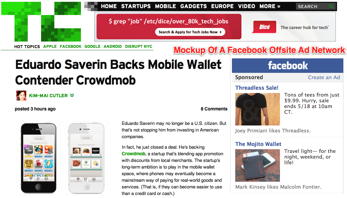 Facebook has denied this product is in the works whenever it’s been asked, but last week it revised its privacy policy to expand its ability to serve ads to its user while they’re outside of Facebook.com. There’d be little reason to do this if something wasn’t in the works. The march across the web of its other social plugins such as the Like button have also paved the way for an ad network plugin. It might need to develop or acquire a company with expertise in analyzing site content so it could serve somewhat relevant ads to site visitors who aren’t logged in to Facebook.