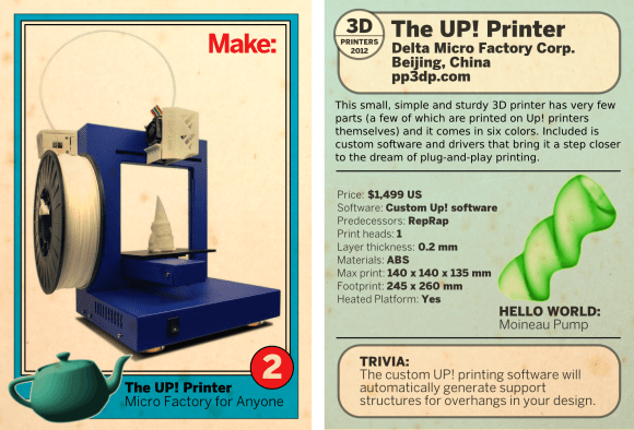 While, arguably, you’re not going to convince many kids to give up their Topps or Pokemon cards for these things, it’s nice to know they exist. They’re 3D Printer trading cards featuring some of the best 3D printers in the world. You got your Makerbot Replicator, your UP! Printer, and your Printrbot Plus. You got stats on there, a little trivia, some pricing information and then you can trade with your friends (“Awwww man, I need that Reprap clone!”)