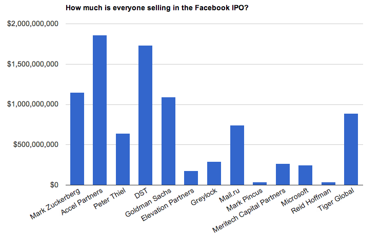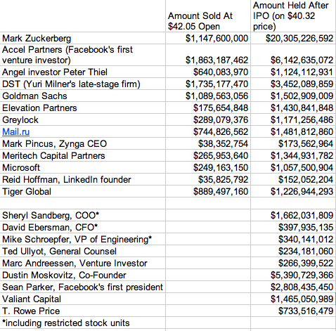 At the time of this writing, it is trading a bit lower, at $40.32, which gives the company about a $111 billion valuation. In Facebook’s S-1, the company listed how many shares main players were set to sell at listing time. Based on the originally sale price of $38 and then Facebook’s current price at $40.32, here are how the values are coming out.