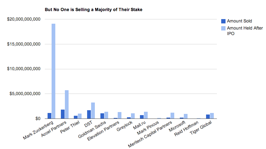 Zuckerberg and early shareholders like Peter Thiel and Accel Partners sold shares in the offering, but other early employees like chief operating officer Sheryl Sandberg and co-founder Dustin Moskovitz held onto their current stakes in the company. They may have sold shares earlier in the private secondary markets or when DST invested in Facebook a few years ago, but we don’t know for sure.