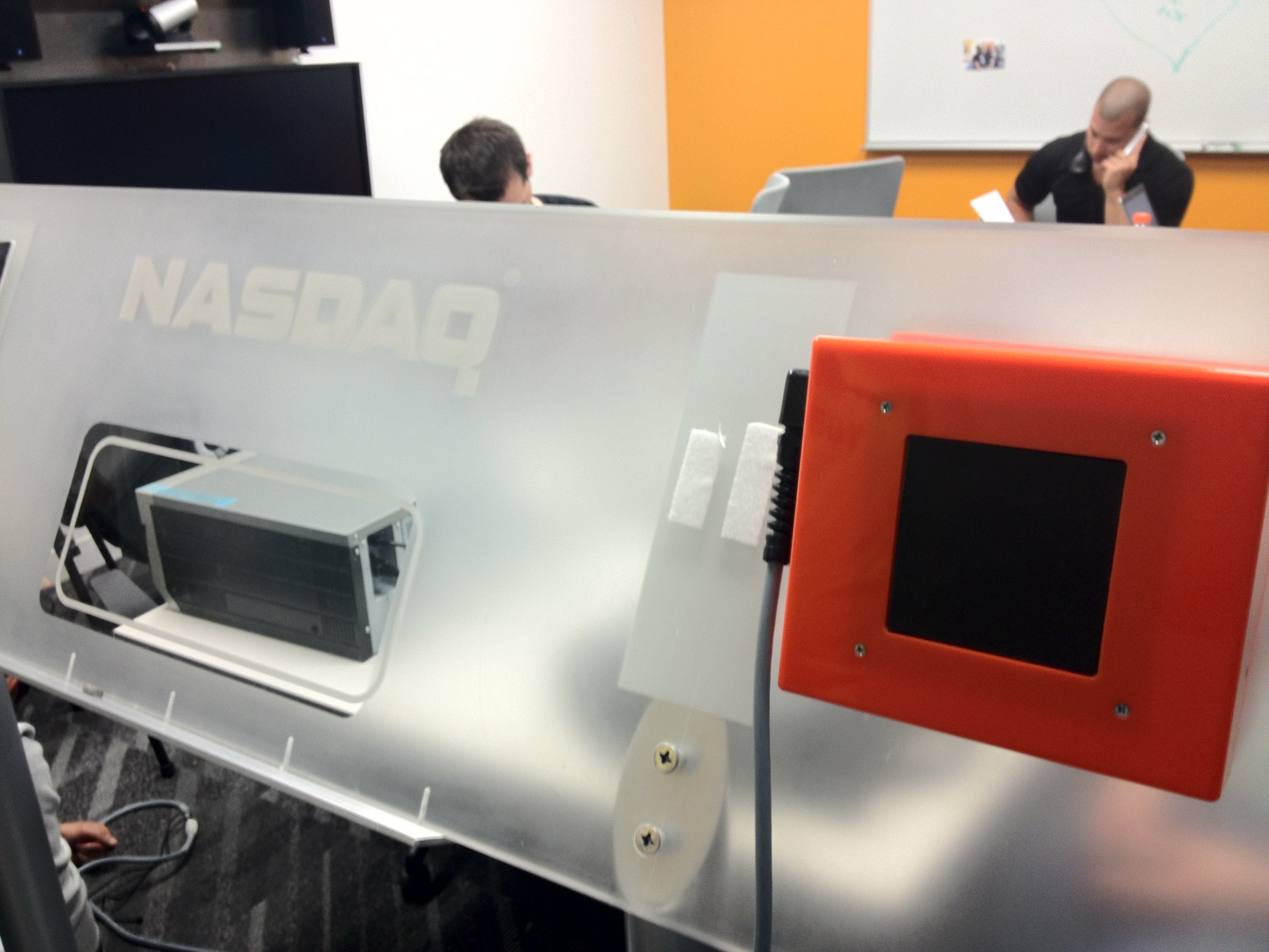 Step two was to see how the actual NASDAQ button worked. By the time NASDAQ arrived on Wednesday, a few other engineers caught wind of the project and offered their help. So five of us headed over to the conference room to check out the button. NASDAQ was game and allowed us to dismantle the button, with only one rule: don’t break it.